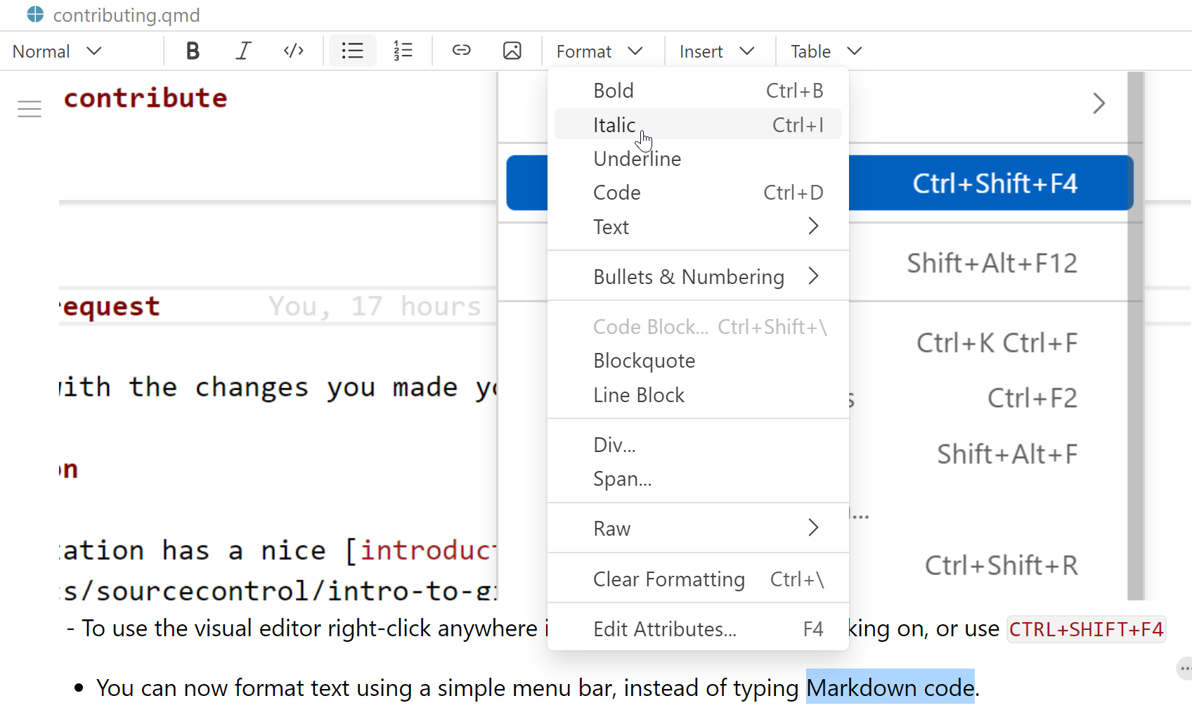 The Quarto Extension includes a Visual Editor with which you can format Quarto pages without typing Markdown code.