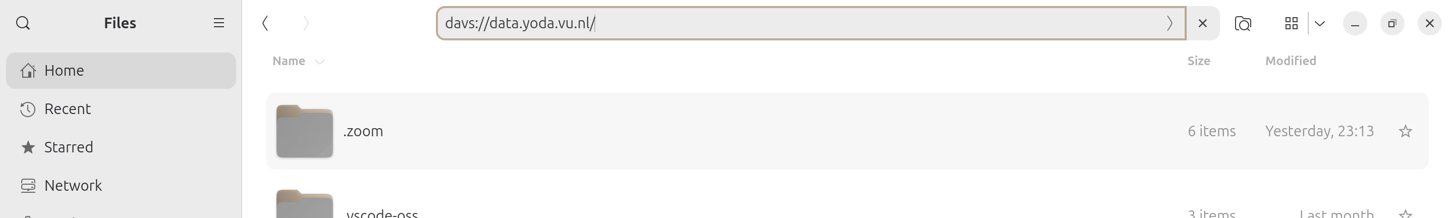 https://data.yoda.vu.nl xxx@vu.nl myDataAccessPasswordRemember that you will need to replace the password when it expires.