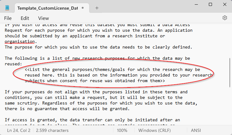 Alter the template by indicating the potential usage purposes of the data and/or any regional restrictions. If you wish to receive advice on creating your license you can contact the Privacy Champion of your faculty (in case of personal data) or Legal (Add ‘advice custom license data management